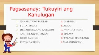 Nainis nagpasan sa krus - nagtitiis sumama sa agos - sumang-ayon Walang ilaw ang mga mata - bulag nagdilang anghel - nagkakatotoo ang sinabi nagbibilang ng poste - walang trabaho suntok sa buwan - mahirap. Malilikot na mga bata. Mababaw ang luha madaling umiyak 2.